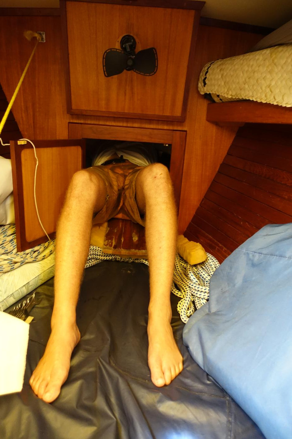 Ich darf immer noch nix heben oder tragen, somit rackerte der arme Christian praktisch alleine, die halbe Zeit steckte er mit dem Oberkörper im engen Bugraum unter der Winsch und musste über Kopf bohren/schrauben/montieren.