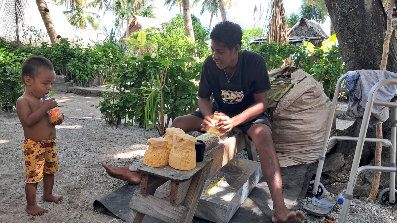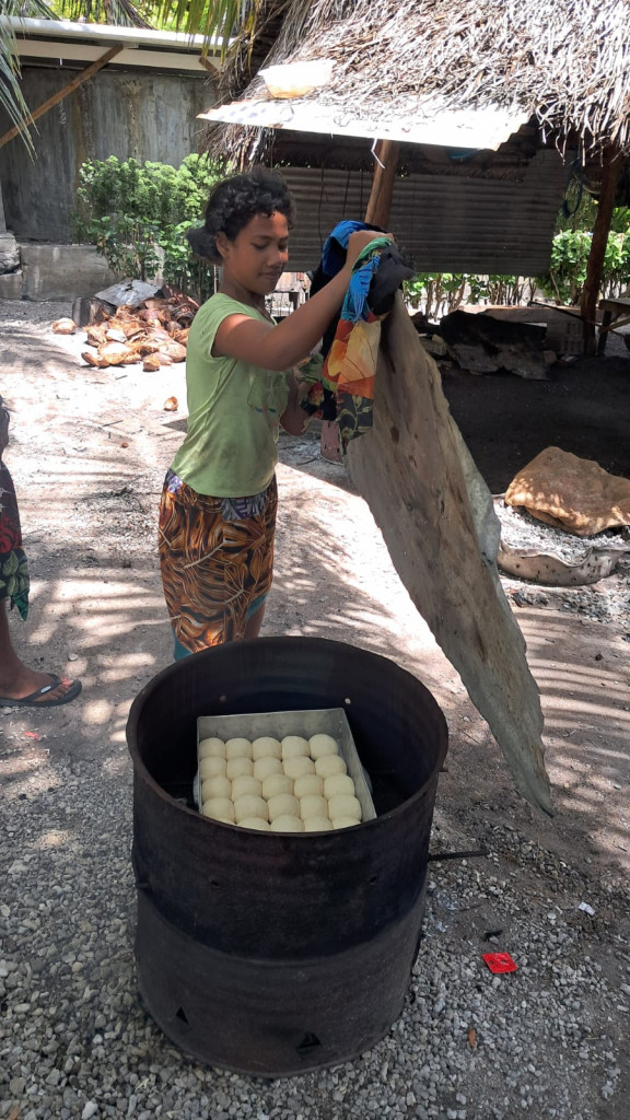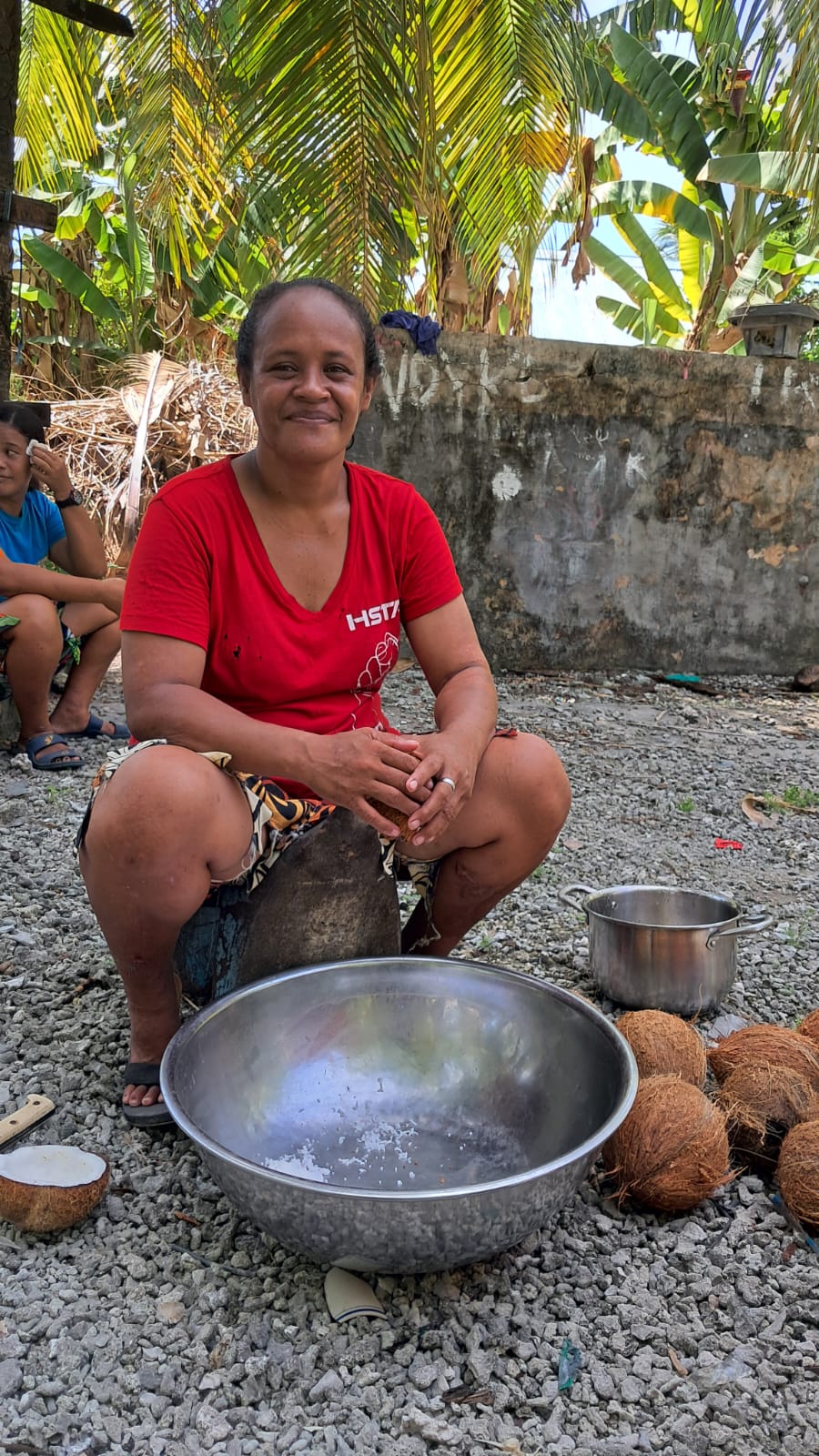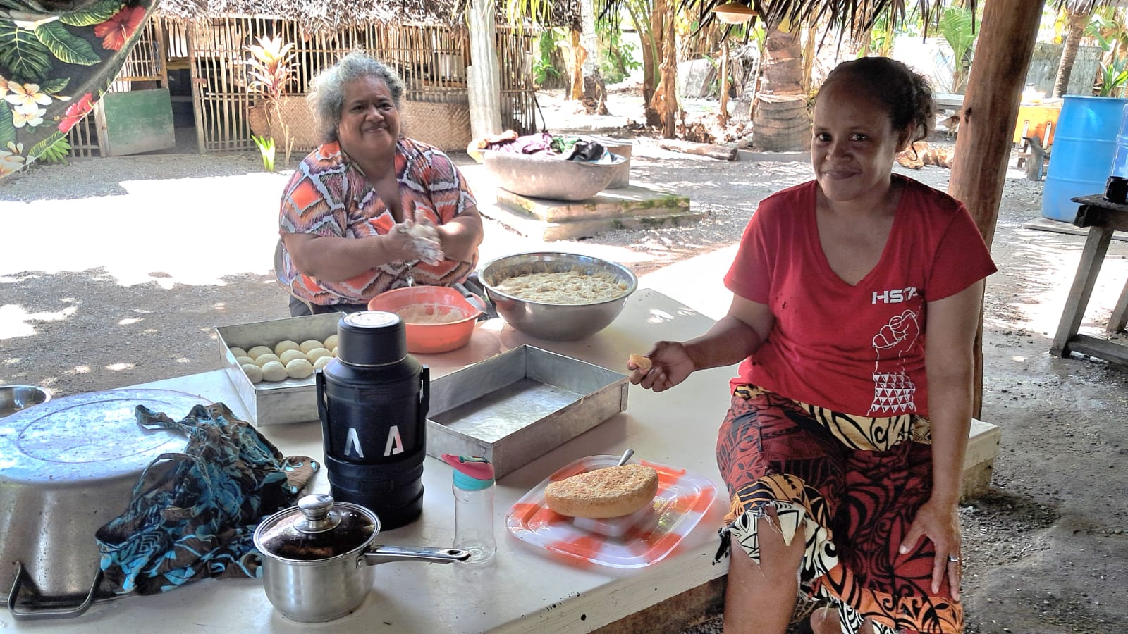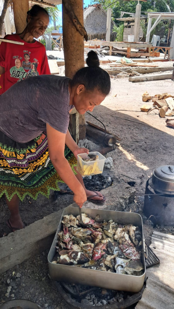 Verona, eine der Lehrerinnen, gab uns gegrillten Fisch und Brotfrucht Chips mit, als wir bei ihrem Haus vorbei kamen
