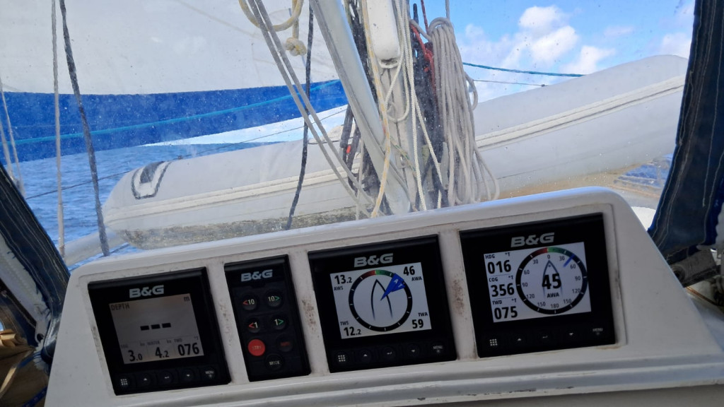 Es war bis jetzt kein leichter Törn: statt dem versprochenen Südost kämpfen wir mit einem Nordostwind mit vielen Squalls und eine westsetzende Strömung um die 2 Knoten macht es uns auch nicht leichter, somit krabben wir gaaaaanz langsam dahin.
